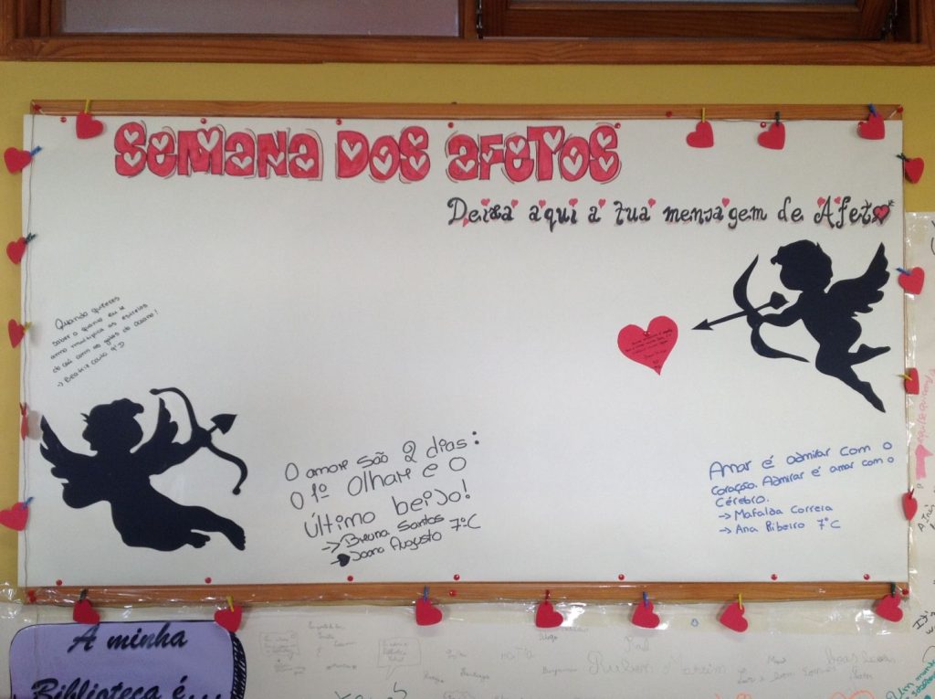 Amor, amizade, carinho, ternura, estima, simpatia, afeição… O melhor de tudo para encher o coração!? Esta semana pedimos aos nossos alunos para deixarem uma mensagem de afeto a alguém de quem gostassem ( familiar, amigo/a, colega, namorado/a…), no mural dos afetos, existente na biblioteca.