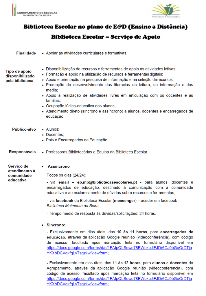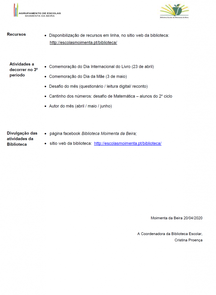 Visto que o terceiro período escolar se desenvolverá em grande parte sem atividades letivas presenciais, a Biblioteca Escolar definiu o seu plano de Ensino @ Distância, seguindo as orientações da Rede de Bibliotecas Escolares, no intuito de apoiar os alunos no seu estudo, os docentes no seu trabalho e os encarregados de educação.