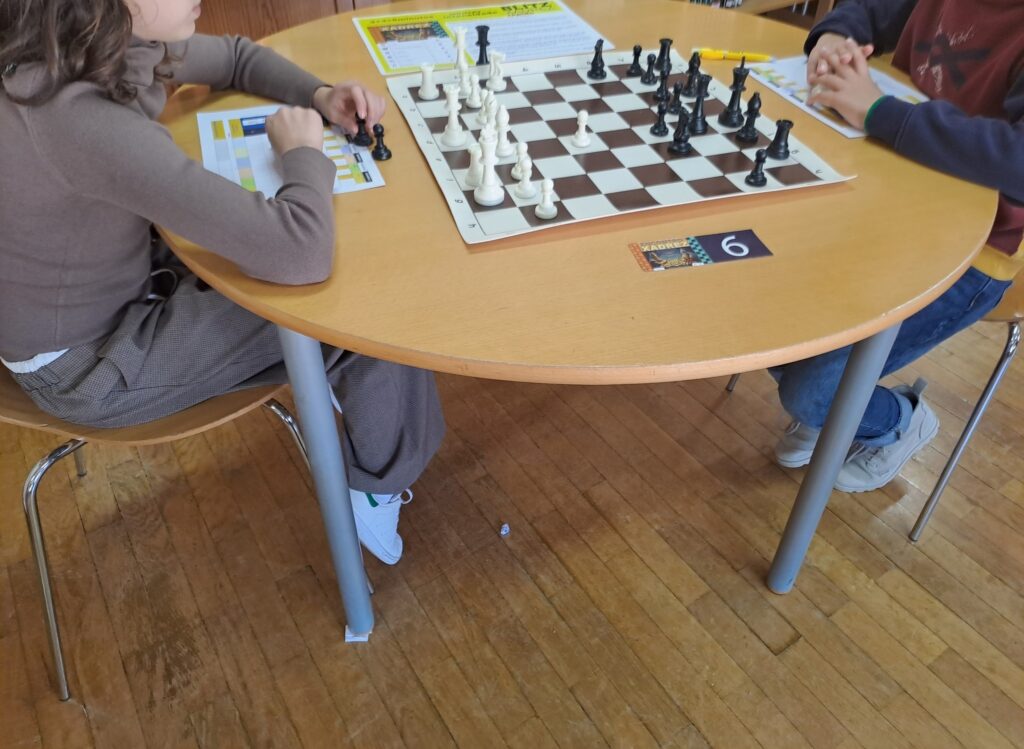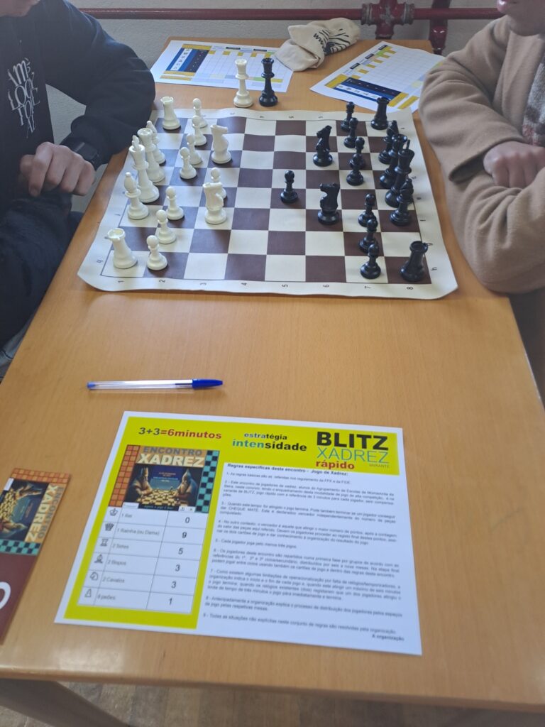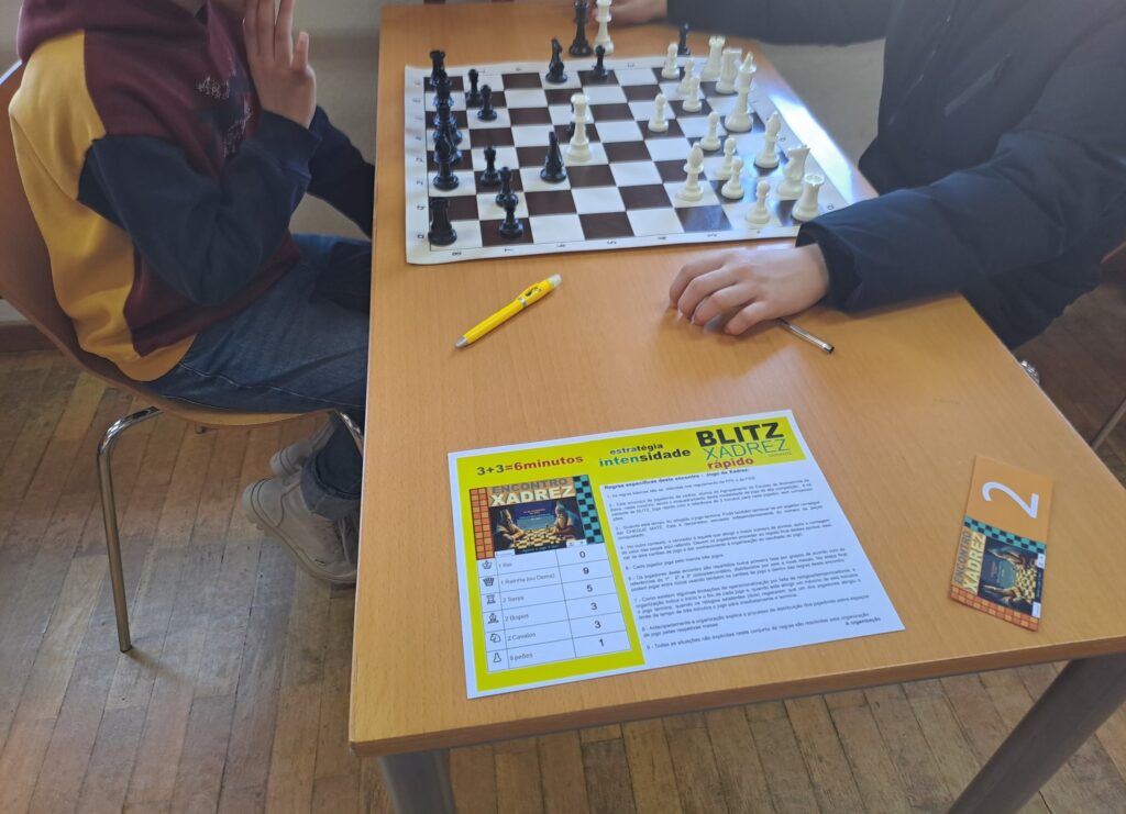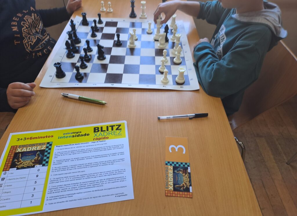Alunos praticantes de xadrez, do 1º / 2º / 3º ciclos e do ensino secundário, pertencentes ao Clube de Xadrez, reuniram-se, hoje, na biblioteca escolar, para uma tarde de Xadrez Blitz, que é uma variante do xadrez que emprega uma quantidade de tempo de 3 minutos para cada jogador.