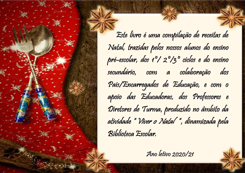 Para assinalar a época natalícia, a Biblioteca Escolar elaborou um livro digital de Receitas de Natal, no âmbito da atividade Viver o Natal, no qual participaram os alunos de todos os níveis de ensino, desde o pré-escolar ao ensino secundário, com a colaboração dos respetivos Encarregados de Educação e com o apoio das Educadoras, Professores e Diretores de turma.
