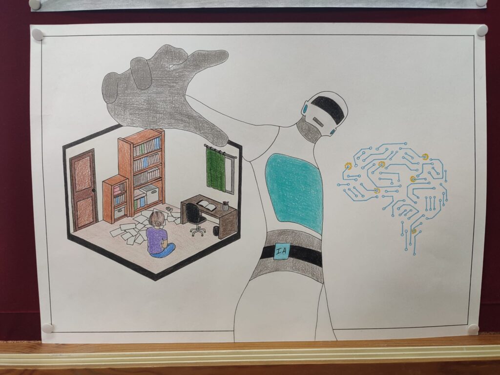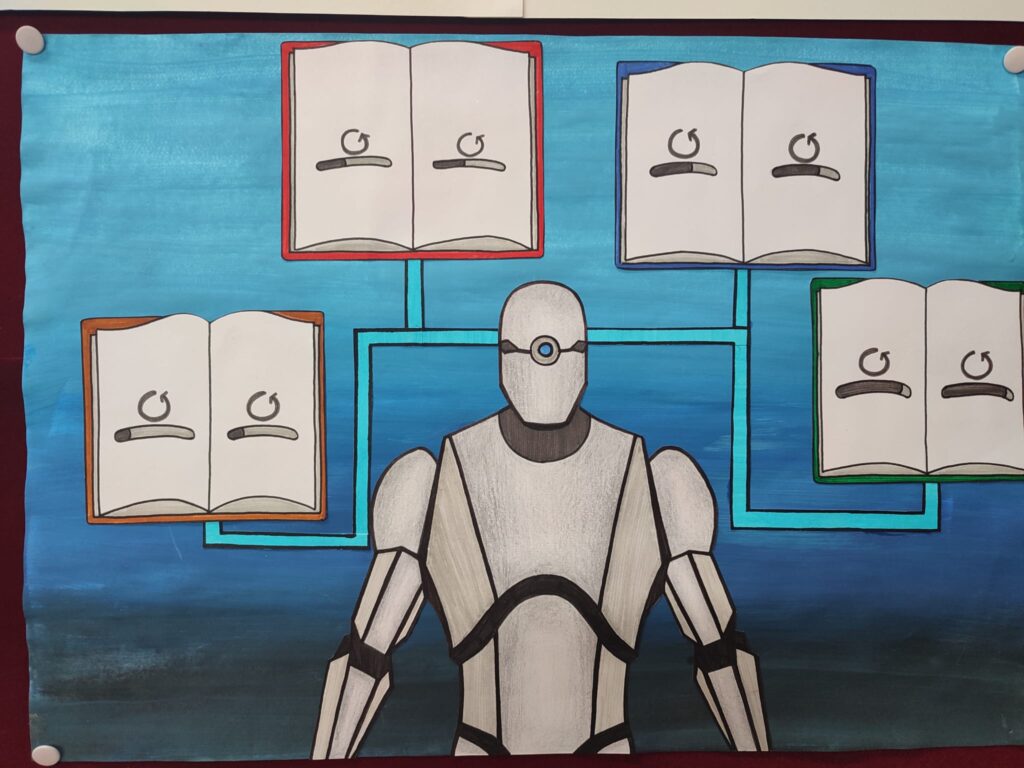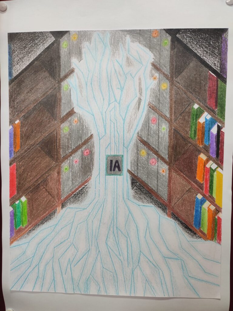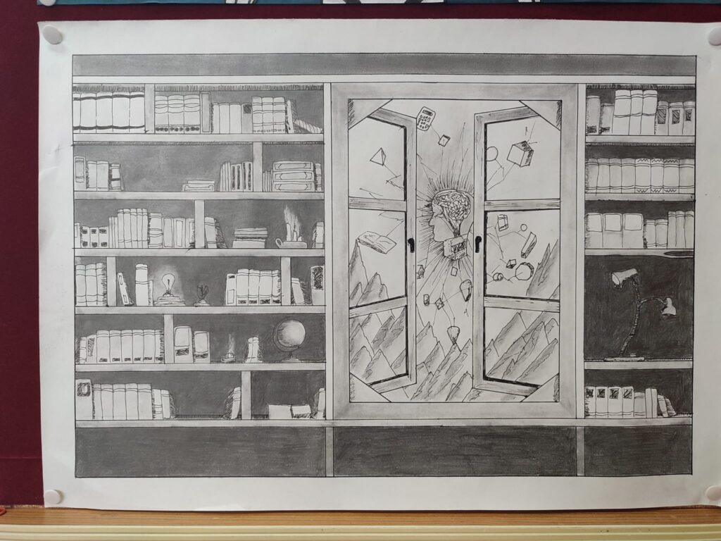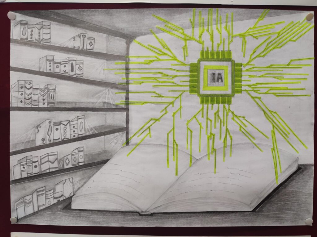 Ilustrações realizadas pelos alunos do Curso de Artes Visuais do 12ºD, na disciplina de Desenho A, no âmbito do tema do Mês Internacional da Biblioteca Escolar “Para além das estantes: IA, bibliotecas e o futuro das histórias”